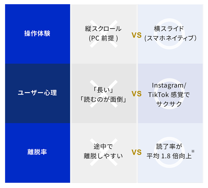 スマホネイティブなスワイプ設計で、読了率を上げて離脱を減らします。