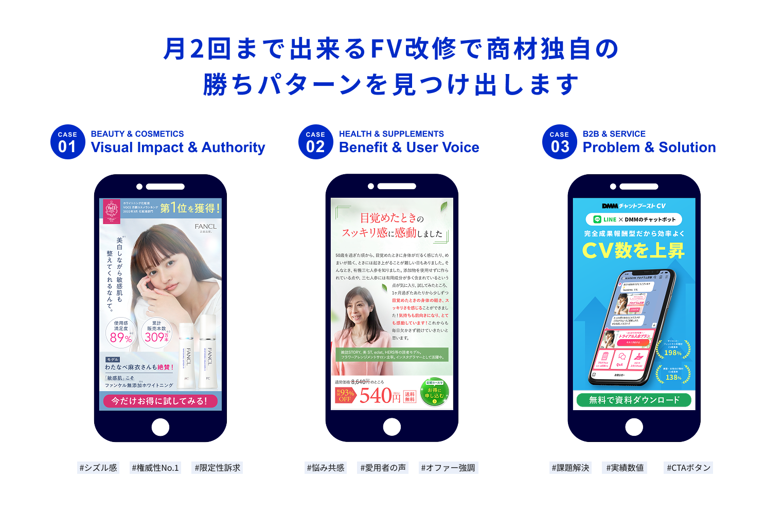 スワイプ型LPではこの入口設計が特に重要。だから私たちは、FVの改善を繰り返し、続きを読みたくなる入口をつくります。